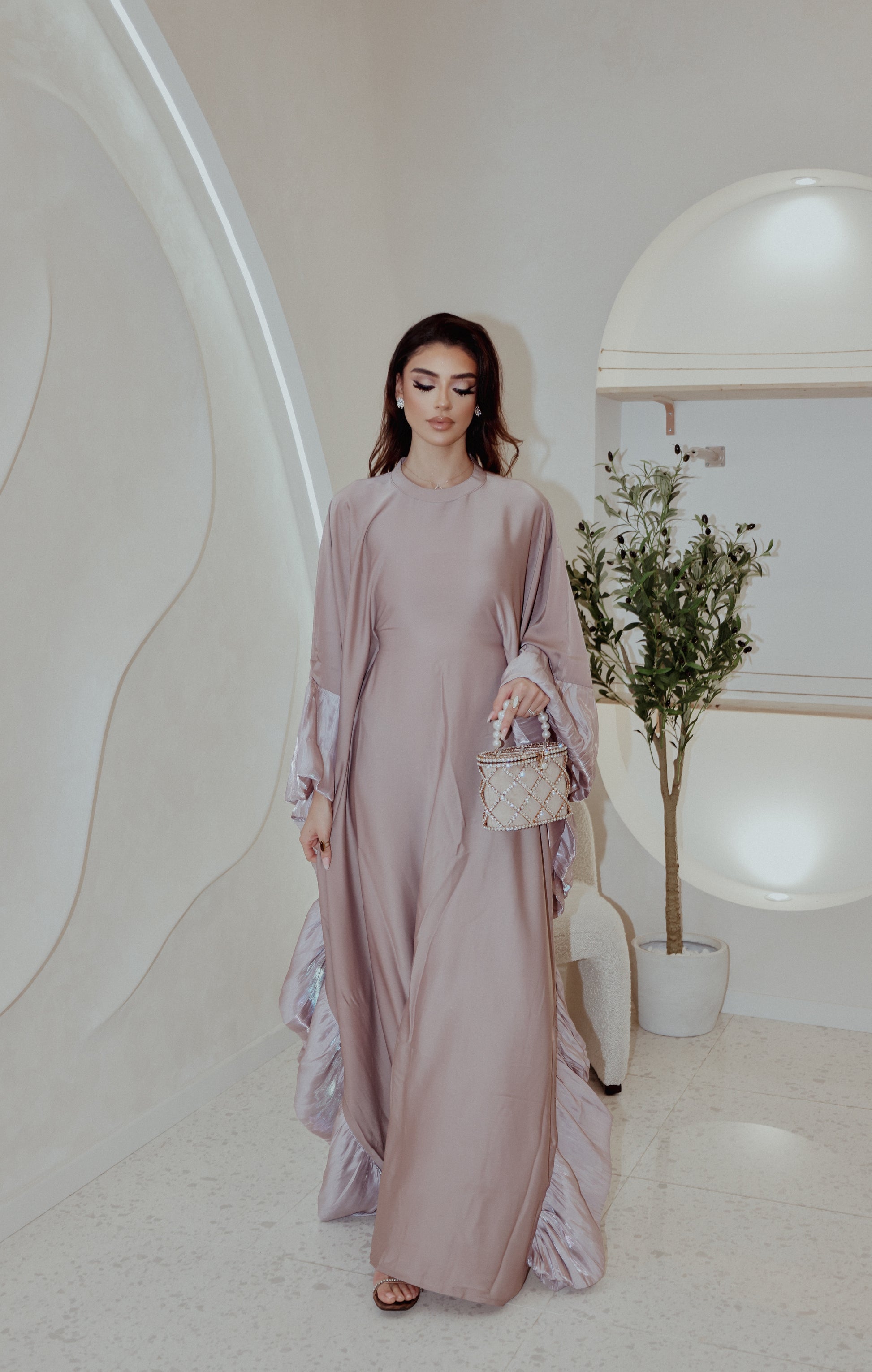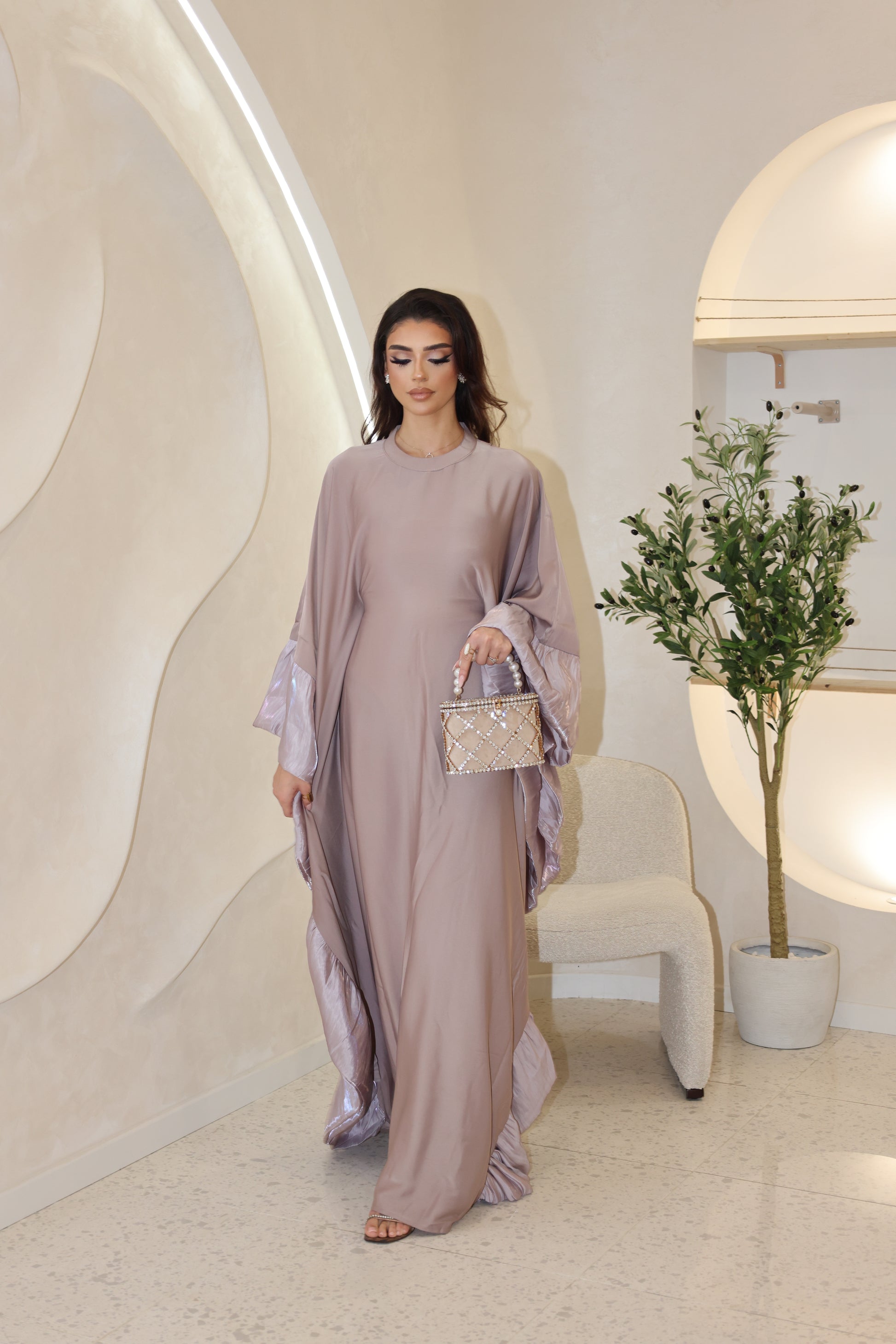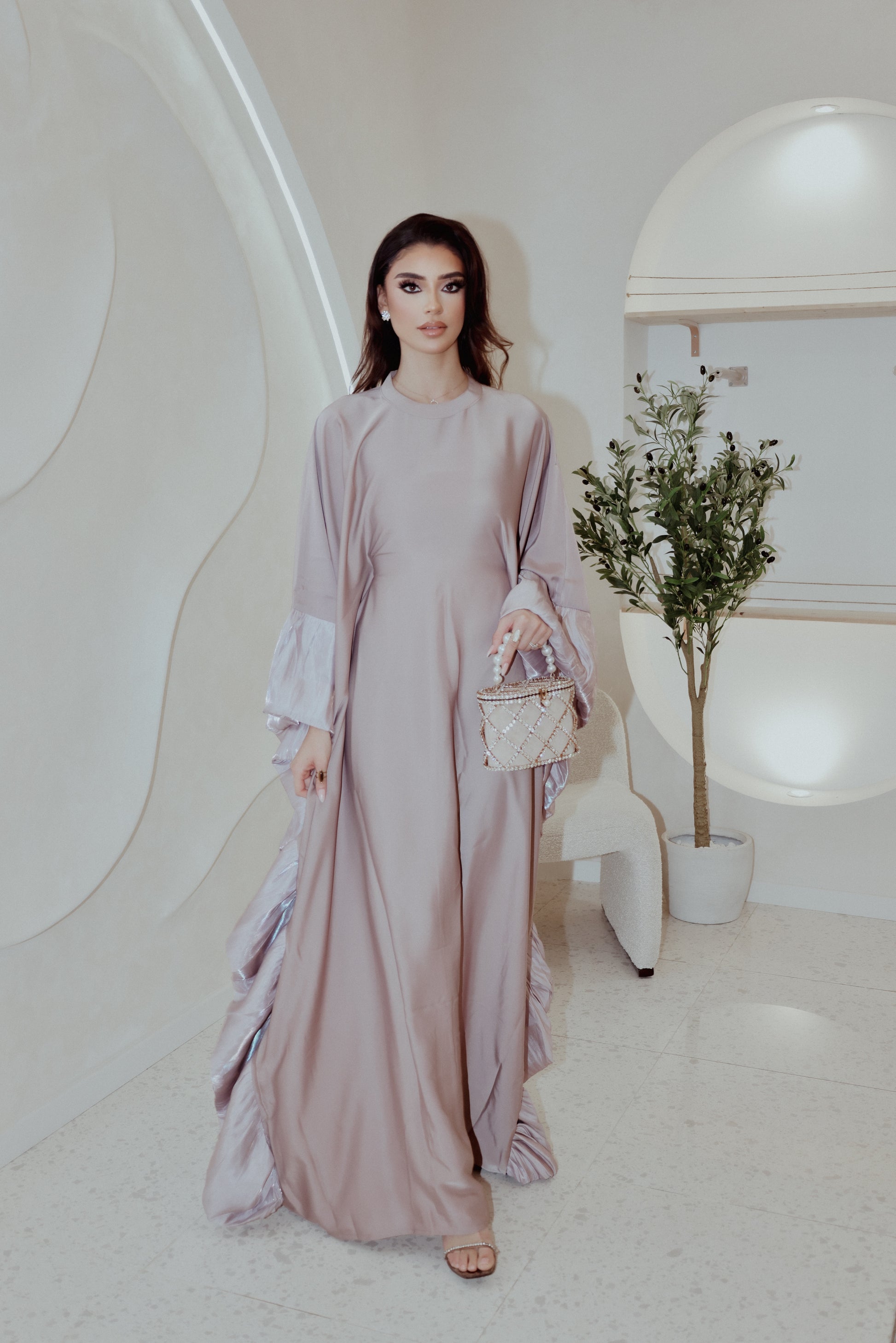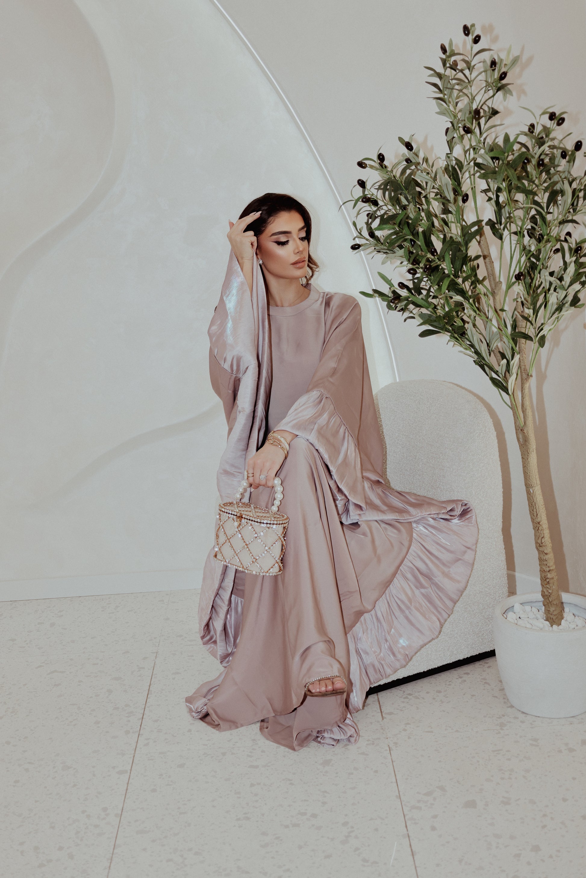 Élégance et légèreté. Cette abaya aux reflets satinés se distingue par ses manches volumineuses ornées d'un fini scintillant.